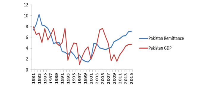 Figure-3. Personal received of remittance and GDP growth rate: Pakistan; 1981-2015.