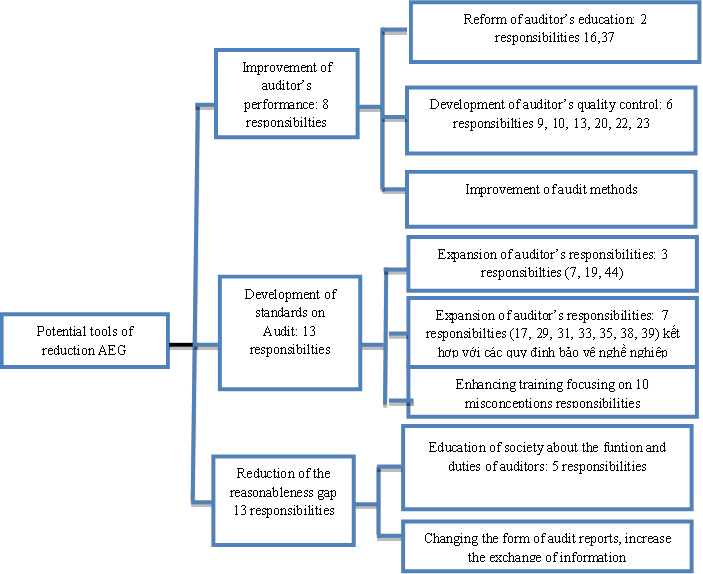 To narrow the AEG in Vietnam, the study results indicated the need to improve auditor performance for eight responsibilities, develop standards on auditing for thirteen responsibilities, enhance education training focusing on ten responsibilities and increase the exchange of information by changing the form of audit reports for eight responsibilities as per Figure 3.