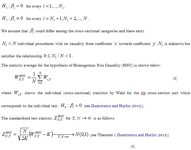 The alternative hypothesis is defined as the Heterogeneous Non-Causality hypothesis-(HENC)]. In the alternative hypothesis we have two cross-sectional sub-categories.