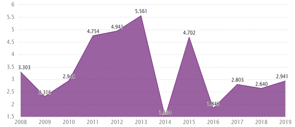 Since 1999, the average national minimum wage has been increasing at an average of 13% annually. As can be seen in Figure 1, labor productivity in Indonesia fluctuates significantly. In 2019 labor productivity grew at a rate of 2.941%, and the relatively high increases in minimum wage in certain years have caused uncertainty for businesses. However, the increase of the provincial minimum wage since 2007 is no longer consistent with the increase due to inflation, basic living requirements and the scale of the wage change itself.