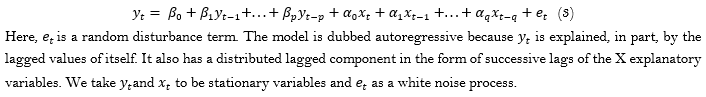Broadly speaking, an ARDL model can be used to test for cointegration and can estimate long-run and short-run dynamics. The model allows us to determine what the effects are of a change in a policy variable. The model of the form used is as follows: