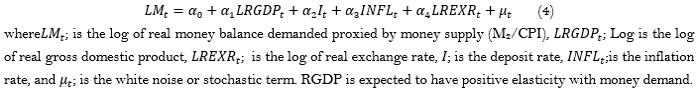 The general specification of money demand in most macroeconomic literature postulates money demand as a function of income and interest rate. However, the conventional money demand function is extended by introducing exchange rate and inflation rate. Mundell (1963) suggested that exchange rate should be included in the standard money demand function to take the currency substitution phenomenon into account. Against this background, this research postulates an open economy money demand function, which relates real money balance as a function of real income, interest rates, inflation rate and exchange rate. To efficiently establish the determinants of money demand in Nigeria, Equation 4 is transformed into the ARDL model as indicated in Equation 5. Hence, it shows the linear relationship between money supply (LM) and other indicators, such as inflation (INFL), real exchange rate (REXR) and real gross domestic product (RGDP) growth.