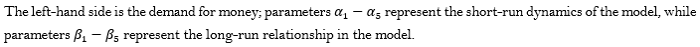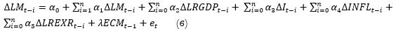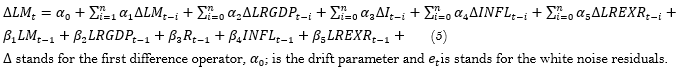 This is because the higher the income the higher the money demand because people will want to increase their spending in relation to an increase in income. Deposit rate is expected to have a negative relationship with money demand due to the fact that an increase in the interest rate offered to savers will result in a lower money demand from the banks. Inflation rate is expected to have positive elasticity with money demand. The higher the rate of inflation expected, the more people will tend to spend their money rather than save it for the future where the real value of money will reduce due to inflation. Real exchange rate is expected to have either a positive or a negative elasticity with money demand. According to Lungu et al. (2012), if the increase in exchange rate (depreciation of domestic currency) is perceived as an increase in wealth and leads to a rise in domestic money, the coefficient of exchange rate is positive, but if the increase in exchange rate leads to a decrease in domestic money demand (currency substitution), then the coefficient of exchange rate is negative as people will hold more foreign currency and less domestic currency. The ARDL model stipulated by Pesaran., Shin, and Smith (2001),as shown in Equation 3,is further established in Equation 5 using the key variables for the study.