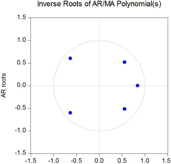 Note: Since all roots lie within the circle, the model is said to be stable (stationary). |