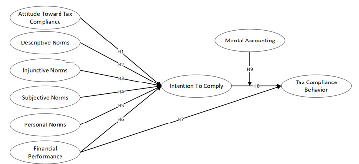 Perceived behavioral control is defined as individuals’ beliefs about how easy or difficult it is to perform a task, and prior studies have measured perceived behavioral control based on perceptional approach. This study proposes financial performance as another measure to represent perceived behavioral control. Firms with poor financial performance are more motivated to engage in tax evasion (Ayers, Call, & Schwab, 2018; Feizi, Panahi, Keshavarz, Mirzaee, & Mosavi, 2016). Conversely, firms with better financial performance tend to report their taxes compliantly (Harinurdin, 2009). Accordingly, better (worse) financial performance ensures taxpayers that tax compliance is easy (difficult). In addition, this study also proposes the role of mental accounting as a variable that moderates the effect of tax compliance intentions on tax compliance. Mental accounting in the context of taxation can be interpreted as an awareness of the taxpayer's thoughts about the allocation of the proceeds of a sale. Every time a sales transaction occurs, the taxpayer's mind immediately remembers that that particular part of the sale must be recorded to pay taxes. Thus, mental accounting by taxpayers is expected to strengthen the effect of the intention to influence tax compliance intentions on tax compliance.