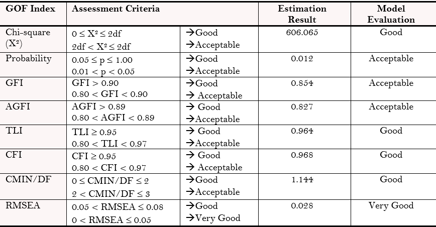 This study runs the validity test of the construct indicators with the loading factor values. From 39 empirical indicators, four variable indicators have loading factor values below 0.5, namely KK5, SAKP1, ND4, and NI4. These indicators are then discarded because they do not reflect their measured variables’ unidimensionality levels. Other indicators have loading factor values between 0.508 and 0.946, implying that the data is valid. The reliability test reveals that all constructs are reliable because their values are greater than 0.7 (between 0.717 and 0.892).