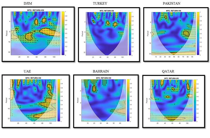 In the case of Turkey, small regions of yellow were detected in the medium term period (4–8 months) in 2013 to 2017. Similarly, Bahrain exhibited a small region of yellow for a short-term period in 2012. Qatar also has a small island of yellow in the short and medium terms, but the arrow pointing in phase shows that they have a significant positive relationship, and it points upward in 2019 indicating that the VIX is the leading variable. In Malaysia, a very weak dependency between the VIX and returns was detected in the medium term and none in the short and long terms. The arrow is in phase and indicates a positive relationship between stock market returns and the VIX, and the arrow is pointing down to the right, which infers that stock return is the leading variable.