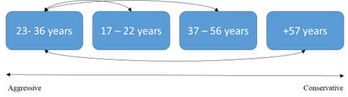 Investment behavior relates to the courage to take risks associated with the ownership of stocks indexed in LQ45. When investors have a composition of LQ45 indexed stocks, they are considered to be risk-averse. Grouping refers to investment in the four stages of life. According to Sherman, Wang, & Yuh (2010), age differences reflect dissimilar knowledge obtained from investment-related literacy. Investment practice requires good knowledge in each decision-making process. Investors with an older age will be better at investing, this is because they have more experience and knowledge than younger investors. (Korniotis & Kumar, 2011). Nairn (2005) stated investors with an older age will be more risk averse than younger investors, this is because young investors can still recover from potential financial losses. For this reason, they tend to take more risks than older people. Kiran & Rao (2005) suggested that the age factor greatly influences the risks taken in investing. The WHO (2017) has produced age classification as follows: 1) Under five period = 0–5 years; 2) Childhood = 6–11; 3) Teenagers = 12–17; 4) Adult period = 18–40; and old age = 41–65.