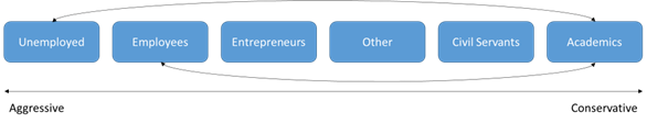 The occupation of investors can be divided into several groups, including 1) private employees, 2) state civil servants, 3) academics, 4) entrepreneurs, 5) unemployed, and 6) others. These groups have internalized similar attitudes in making important decisions. In investment activities, the main occupation can initiate an attitude in the face of risk. Initially, for demographic data, 17,849 data were obtained from securities investors who are members of the Indonesia Stock Exchange. Then the selection was carried out by only taking individual investors, which were 16,177 customers from the entire data. Then observed data on investors who are actively conducting transactions, where it can be seen from the ownership of shares in the investor's portfolio at the end of the year. This study only uses demographic data of individual investors who have portfolios in the form of stocks. In the end, 3,911 demographic data of individual investors who have stock portfolios and are actively transacting are used. MacCrimmon & Wehrung (1986) stated that employees tend to be less willing to take big risks than entrepreneurs because they look at each other differently. This shows that private employees should be more careful in their behavior. Entrepreneurs are used to dealing with risks, and the bigger the risk, the bigger the income.