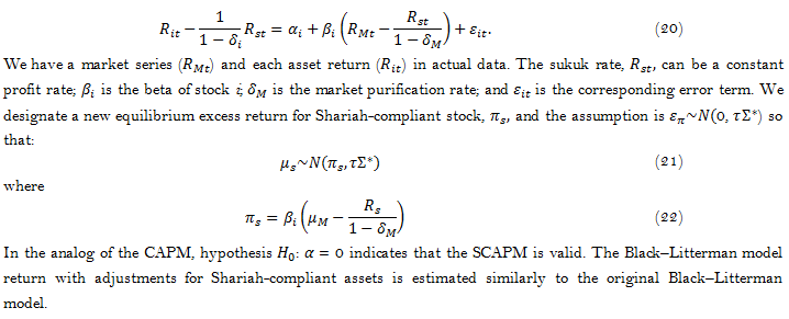 So, these studies motivate a new development of the BL model by utilizing a unique SCAPM for the Shariah portfolio. We develop a modifying BL model with a new SCAPM for Shariah-compliant stocks regarding zakat and purification.