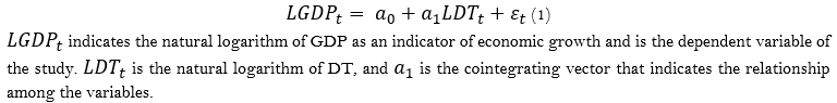 The current study is based on a quantitative research approach as it investigates the impact of DT on the GDP (economic growth) of the Jordanian economy. It incorporates secondary quantitative data for the period from 2000 to 2021, which is analyzed using the autoregressive distributed lag (ARDL) approach. The data was collected from the official site of the Jordanian e-government (https://portal.jordan.gov.jo ) and from the website of the World Bank (http://data.worldbank.org ). The variables under study are initially switched to their natural logarithms (Shahbaz, Hye, Tiwari, & Leitao, 2016) so that consistent results could be achieved. For the empirical estimation of the proposed hypothesis2, the relationship of the variables under study is stabilized through the following model: