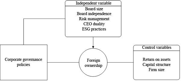 Figure 1 depicts the relationships of CG variables with the foreign ownership. The CG variables include board size, board independence, CEO duality, risk management, and ESG, which have been used to measure the impact of corporate governance on foreign ownership.
