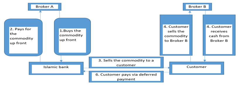 Figure 1 shows how a customer in Somalia could obtain cash financing from an Islamic bank utilizing tawarruq. First, an Islamic bank purchases a product from the market and sells it to the customer on a deferred payment. Then, the customer sells the same product to the market for cash to obtain the funds they require.