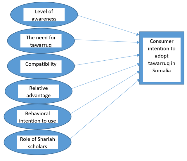 Islamic banks are still relatively new in Somalia and have a small amount of funding, and Islamic banks in Somalia in particular have liquidity issues (Jibril, 2020; Musse, Rashid, & Zainol, 2019). There is no method for a consumer to obtain the cash they require from a bank in Somalia since the financial sector has only recently established itself and lacks adequate liquidity management. Customers of Somalia's Islamic banks have access to Murabaha, which can be used to purchase goods such as real estate, cars, and other tangible goods. However, customers are not always looking to purchase an asset or a commodity; instead, they are looking to obtain cash for a variety of uses, including weddings, education, businesses, and personal use. Therefore, Somalian Islamic banks must create new products, such as Tawarruq, that allow customers to get the cash they require. Tawarruq is one of the Shariah-compliant contracts that is regularly used by Islamic banking institutions throughout the world, particularly when it comes to making it easier for consumers to obtain funds. Tawarruq is not practiced in Somalia since the country's Islamic financial sector is still developing. As one of several products, tawarruq is not performed in Somalia for many reasons, including a lack of human resources, a lack of awareness, and potential Shariah issues (Jibril, 2020; Musse et al., 2019). To evaluate the tawarruq contract's overall applications in Somalia for cash financing, this study focuses on some different variables, including level of awareness, the need for tawarruq, compatibility, relative advantage, behavioral intention to use it, and the role of Shariah scholars (Amin, Abdul-Rahman, Ramayah, Supinah, & Mohd-Aris, 2014; Faisal, Akhtar, and Rehman, 2014; Jansson, 2011; Obeid & Kaabachi, 2016). These factors were also used in previous studies (Amin & Hamid, 2018; Haron, Subar, & Ibrahim, 2020; Obeid & Kaabachi, 2016).