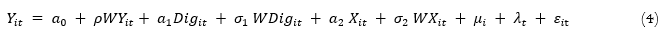 Where ρ represents the spatial autocorrelation coefficient, W represents the spatial weight matrix, and this paper uses the geographic distance weight matrix as well as the economic-geographic nested weight matrix to systematically analyze the spatial effects of the impact of digital economic development on environmental problems. σ is the spatial interaction coefficient of the main explanatory and control variables, and the general common spatial econometric models are the spatial autoregressive model (SAR), the spatial error model (SEM), and the spatial Durbin model (SDM). The remaining variables are the same as in Equation 1.