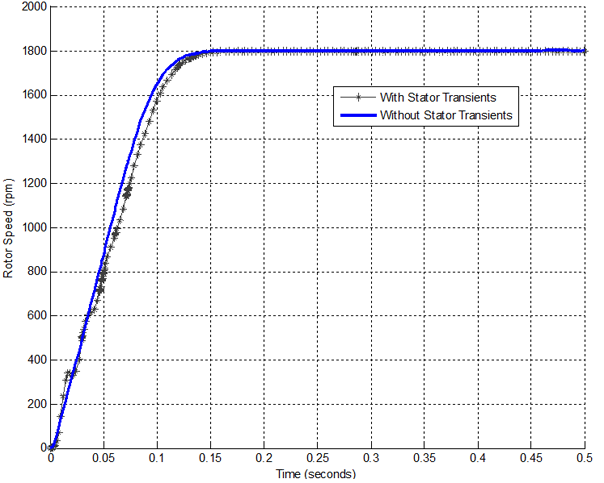 From Figure 3, it is seen that the both plots are similar. They have the same steady state speed of 1800 rpm. Also, they reach this steady state at the same time, 0.15 second. The only obvious difference is noticed during the transient state, that is, between 0 to 0.15 second. The transient behavior is not exactly the same, but they are closely similar. This slight difference is as a result of the stator transients being neglected. It has, therefore, been shown that the stator transient can be used to predict the speed characteristics of an induction motor.