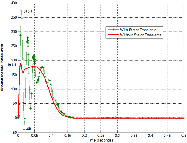 From Figure 4, it can also be seen that both plots are similar. They have the same steady state torque of 0 Nm. They also reach their steady state at the same time, 0.15 second. However, the plot with stator transients has a maximum torque of 373.7 Nm and a minimum value of -40 Nm, while the plot without stator transients has a maximum torque of 191.1 Nm and a minimum value of 0 Nm. Also, the reduced model has lower overshoots. The difference in the two plots is plain and obvious, unlike that of the rotor speed. It can be deduced, therefore, that this reduced model cannot effectively predict the behavior of the torque of the induction motor.