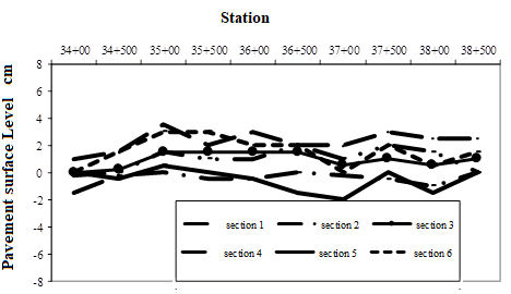 Figure 6 shows typical distress at stations 38+000 to Station 38+500 (straight section – cut zone), poor subbase finished level at the start of the section could be considered as the major cause of the rutting at the overlaying asphalt concrete layers. Moreover, the great variation in the stiffness of binder and surface courses throughout the cross-section is referring to the shear failure which causes the rutting. The over compaction especially at the start of the section is another cause of the pavement distress.