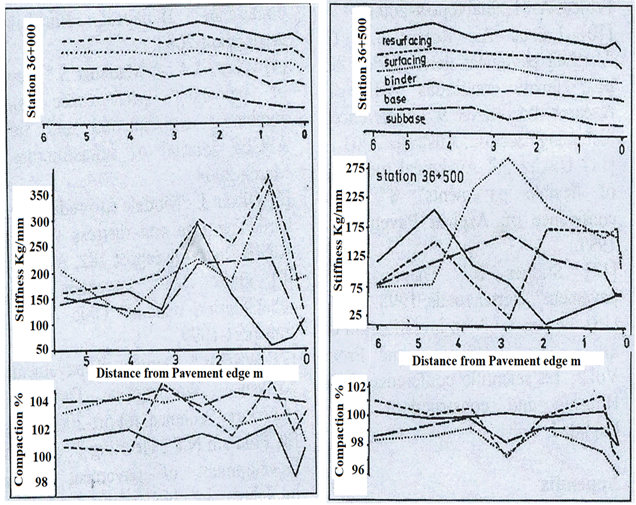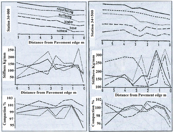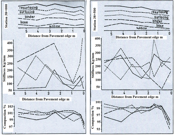 Figure 5 demonstrates typical distress at stations 37+000 to Station 37+500 (horizontal curve turning right), it can be observed that the asphalt concrete surface and resurfacing courses are responsible for the rutting in the section. The great variation in the stiffness of such layers indicates poor homogeneity throughout the section. This was further supported by the over compaction exhibited at the wheel paths.