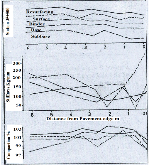 Figure 3 exhibit typical distress at stations 35+500 (straight section), it can be observed that subbase layer is responsible for the shear failure of asphalt stabilized base course. Shear failure was also extended to the binder, surfacing and resurfacing courses. This finding was further supported with the great variation of the stiffness among the cross section of the surface course. This may be attributed to the possible non homogeneity of asphalt concrete material and possible segregation during the spreading process of surface course. On the other hand, over compaction could be noted for base and binder courses. It can be concluded that Surfacing and resurfacing action were not the perfect solution for that section rather than milling the underneath binder and base layers and maintaining and leveling the subbase layer.