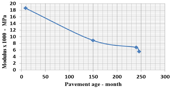 Critical pavement construction details such as adequate compaction effort may be represented in this model by voids content in each layer. It was observed that the pavement structural responses are highly dependent on modulus of Asphalt Concrete as shown in Figure 7 the rate of deterioration increases gently at the early age of pavement, and then it increases at faster rate as it reaches the expected design life of the pavement.