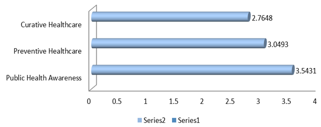 Cronbach alpha was used for checking the reliability of the instruments and also internal consistency of the items. Value of reliability of scale depends upon value of alpha level. Range of alpha level is between 0-1. If the alpha value is 0.4 it is not acceptable, if it is 0.5 it is poor, if value of alpha is 0.6 it is questionable, if the value of alpha is 0.7 it is acceptable and alpha value 0.8 and above is considered very good and value of 0.9 and above is excellent [18] . In study Table 1 Cronbach alpha value for public health awareness is 0.966, while for preventive healthcare is 0.762, alpha value for curative healthcare is 0.925 and overall alpha value for scale is 0.718. These values are above the standard criteria i.e. 0.7 so all the instruments of this study are reliable.