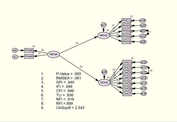 Figure-3. Structurla model AMOS-SEM (analysis of moment structure structural equation modeling) pvalue: significant value, RMSEA: Root mean square error of approximation, GFI: Goodness of fit, IFI: Incremental fit index CFI: comparative fit index, TLI: Tucker-lewis index, NFI: Normed fit index, RFI: Relative fit index, Chisq/df: chisquare/degree of freedom.