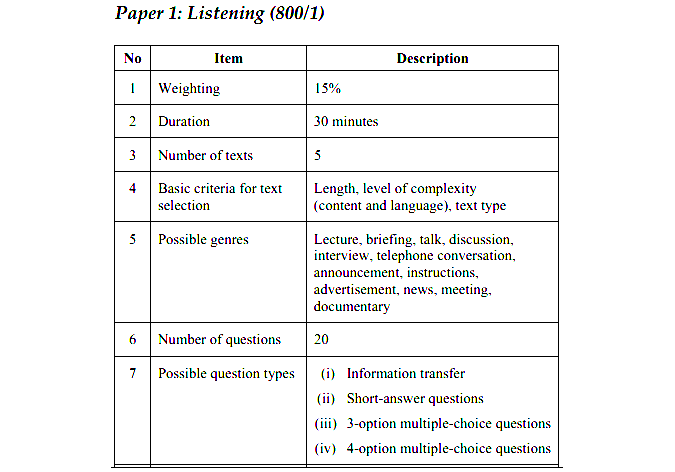 As mentioned previously, Malaysian University English Test (MUET) is consisted of four papers which are made compulsory for students to pass according to the required Bands (1-6) and programmes registered under universities. Instead of reading, students are required to listen attentively to five individual recordings in order to answer comprehension questions which are distributed beforehand. The test consists of three parts where the level of comprehension and critical thinking skills increase in each.