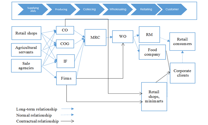 Because the majority of supply chain participants are small business units, household businesses without business registration certificate so the relationships between them are often long-term relationships without contracts, legal constraints or agreements about price, quantity as well as quality (Figure 1). As a result, if the input agricultural materials are in poor quality which causes loss for the farmers, they will be the only one who has to endure it, without any compensation or reimbursement from their suppliers. If there is a bumper crop, farmer will be forced to sell with a cheaper price by merchants or wholesaler. At present, there are two firms which are producing SV in Danang vegetables supply chain, however because of the low capacity, 365 ton/year just accounts for 3.6% of Danang vegetables capacity and 0.05% consumption demand, these two firms hardly have any power in supply chain, and there is no difference in the relationship between them and merchants/wholesalers compared with that of the individual farmers and merchants/wholesalers. These firms have not been able to launch their products on big supermarkets’s shelves such as Co-opmark, Lotte or Big C due to the limited of product category as well as unstable capacity. Similarly, co-operatives and co-operative groups have to encounter with the same situation, the relationship of co-operative/co-operative group and other supply chain participants and that of individual farmer and others supply chain participants are the same, so these organizations have little role in the supply chain.