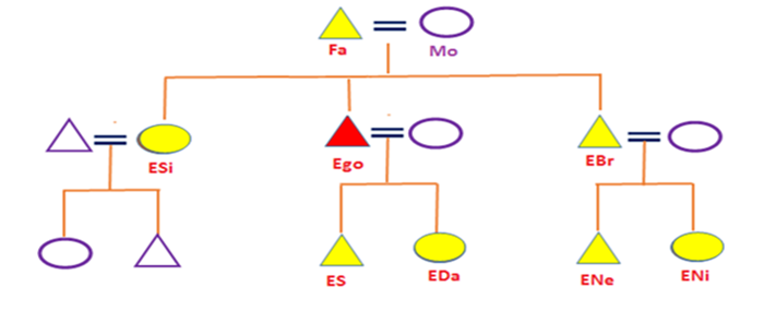 Fig-4. Diagram of Patrilineal Descent system [NB: Fa = Father, Mo=Mother, Si= Sister, Br=Brother, ESi= Ego’s Sister, EBr= Ego’s Brother, ES= Ego’s Son, EDa = Ego’s Daughter, ENe = Ego’s Nephew and ENi = Ego’s Niece ].
