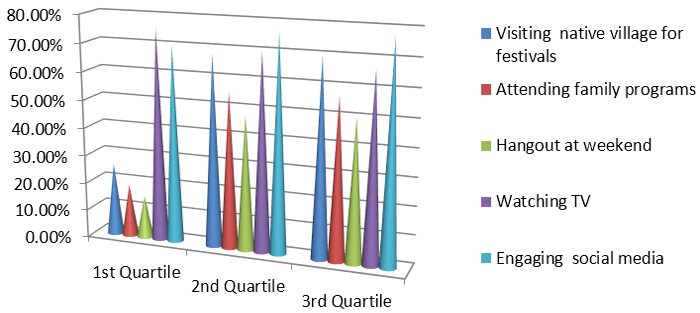 This study finds that in the 1st quartile of the ongoing pandemic (see Figure 11), due to restrictions on the movement of the long-distance transport services and poor income and savings of households only 25% of respondents were visited the native village for celebrating different festivals. Other means of recreation like attaining family programs, weekly hangouts were also almost off in the 1st quartile. Only 18.61% of respondents attended their family programs and 15.14% of respondents were visited different places for hangout purposes at weekends in the 1st quartile. But in the 1st quartile, we can see that more than 70% of respondents spent their time watching television or engaging social sides. In the 2nd and 3rd quartile, people were used to new normal life that why all means of recreation were gradually increased. Almost 70% of respondents celebrated their festivals with their near ones together, 58% of respondents met their relatives at weekends in the 2nd and 3rd quartile. This study also finds that watching television was as usual in both quartiles and 77% of respondents were engaged with social sides in the 2nd quartile but a little bit falls in the 3rd quartile.