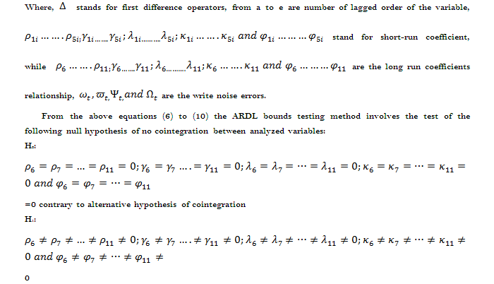 The Autoregressive Distribution Lag bounds testing approach involves the approximation of unrestricted error correction model as specified in the structure below where every variable comes in turn as a predicted variable: