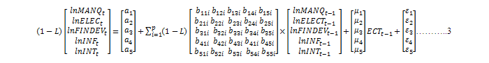 Where MANQ is manufacturing output, ELECT is electricity consumption, INF is inflation rat INT is interest rate and ti is time series operator. For econometric estimation which would permits proper capturing of the nonlinear property and heteroscedasticity of the variables, equation (1) was transformed into linear model below: