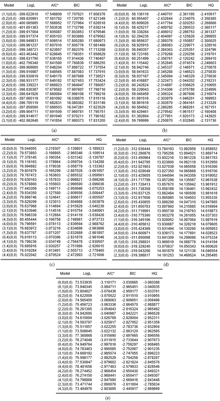 Figure-1. Model Selection Criteria Tables: (a) industry, (b) transport, (c) residential-commercial and public service, (d) agriculture, and (e) sectors total.