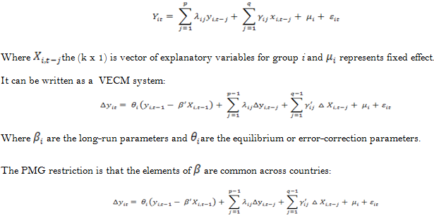 Pesaran, M.H., Y. Shin and R.P. Smith, 1999. Pooled mean group estimation of dynamic heterogeneous panels. Journal of the American Statistical Association, 94(446): 621-634.Available at: https://doi.org/10.1080/01621459.1999.10474156.