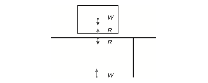 In Figure 7, R acting downward on the table surface is the reaction and R acting upward in the object is the reaction (which is called normal reaction). Incidentally, in this case the weight of the object also works in the direction of action. Therefore, in the diagram, two R’s are one pair of action and reaction forces and two W’s are to be taken as another pair of action and reaction forces (the lower W is assumed to act at the centre of the Earth). The diagram in Figure 7 can be taken to supplement the usual diagram shown in the textbooks.