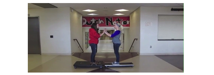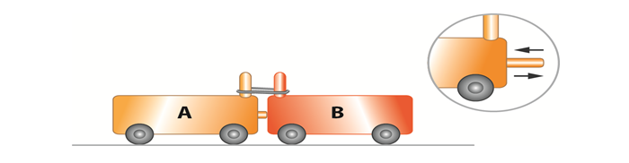 Here, one trolley, trolley A, has a spring which is thrusting upon a similar trolley B, by tying the two trolleys together by a rope which can be instantly cut (Figure 8). Once the rope is instantly cut, the two trolleys will move apart. The trolley with the inbuilt spring will impose the action force on the other trolley. Then the reaction force will be imposed on the first trolley by the second trolley in opposite direction (before the rope is cut each trolley is under the force equilibrium). If the surface on which the trolleys are placed is uniform, the two trolleys travel the same distance to opposite directions and then come to rest (the surface is not frictionless). The equal distances so travelled by the two trolley to opposite directions is an indication that the magnitude of the action force imposed by one trolley on the other and the corresponding reaction force imposed by the second trolley on the first are equal in magnitude and acting on two distinct objects in opposite directions. It was revealed that most of the students were not aware of the fact that the friction force acting on a trolley from the surface causes the trolley to come to the rest and they have the misunderstanding that the action and reaction forces acted on the two trolleys when the rope had been cut still exist. This kind of misconception can be eliminated by the clear explanations of the teacher directing the student what to visualize through interaction of the visual effects. Another practical activity frequently used in classroom teaching to depict the above situation of action and reaction is shown in Figure 9 (it is a screen from a video clip).