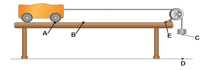In the above setup, an unstreachable light string is attached to a trolley kept on a horizontal table and the string goes through a smooth pulley fixed to the table, at E as shown in Figure 1. A known fixed weight is attached to the other end of the string. When the weight is released from the rest (from C), it moves under a constant force until it reaches the ground. This constant force is the net force of gravitational force applied on the weight (downwards) and the tension of the string acting on the weight (upwards). Here also, as revealed by the discussions held with the students, most of the students think that the gravitation force on the weight is the only force acting on the weight and they were not aware of the tension of the string. The students can observe an acceleration (increasing speed) of the trolley until the weight hits the ground by using this kind of practical setup. The trolley accelerates only in its AB motion, and movement beyond B is with constant velocity (AB = CD). Here what can be observed is the increasing speed. The distances AB and CD should be sufficiently long enough to see the correct type of movement.