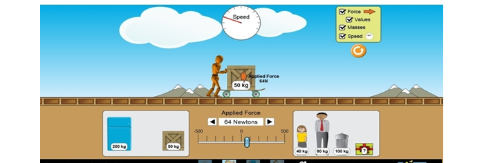To convey the effect of application of a constant force to an object an interactive simulation (PhET) called ‘Force and Motion Basics’2 another representation mode is highly recommended. Under ‘Force and Motion’, ‘Motion’ sub module, the student can decide the force applied by the man and keep the force at a constant value by holding the mouse, and then how the speed increases can be seen on top of the screen form the speedometer (Figure 2).