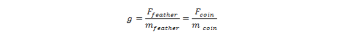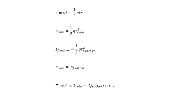 As the acceleration of the two objects are the same, that is, a = g, it canbe shown that time taken by the coin and the feather to reach the ground are equal using the formula,