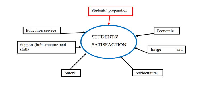 The conceptual framework of this study was based on summarized factors from the literature review (Table 1). The researchers formulated a framework based on the table as independent variables, which were assumed to have crucial impact on student satisfaction, and Indonesian overall students’ satisfaction was considered as a dependent variable. This framework is conceptualized in figure 1.