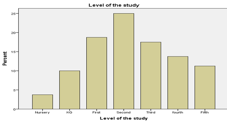 From the following table 4 and Figures 4 it is clear that 3.8% of the respondents level of the study were Nursery, while 10% of the respondents level of the study were KG, 18.8% of the respondents level of the study were First, while 25% of the respondents were study level were second, 17.5% of the respondents were level of the study were third, 13.8% of the respondents study level were fourth, and 11.3% of the respondents were study level were fifth.