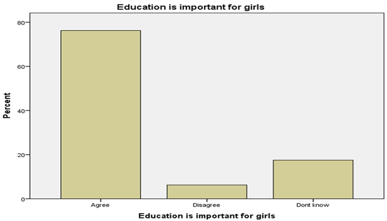 According from the following table 10 and figures 10, shows that 76.3% of the respondents says education is important for girls, while 6.3% of the respondents answer education is not important for girls, while 17.5% of the respondents answer don’t know.