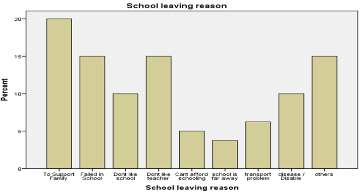 From the following Table 12 and figures 12 at shows that 20% of school living reason is that they want to support family, while 15% of the respondent school leaving reason is that they failed in school, while 10% of the respondent answer the reason of school leaving is that they don’t like school, while 15% of the respondents answer is that they leave school because they don’t like teacher, while 5% of the respondent answer that reason of school leaving is that they can’t afford schooling, while 3.8% of the respondents answer is that the leaving reason of school is that school is far away from has area, while 6.3% of the respondents say reason of school leaving is that transport problem, while 10% of the respondent say reason of school leaving is that they have disease , while 15% of the school leaving reason is other.