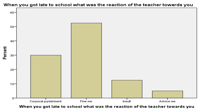 From the following Table 13 and figures 13, it is clear that when respondents go late to school then teacher give him different type of punishment. 30.1 % of the respondent answer they give him corporal punishment, while 52.5% of the respondents say they fine me, while 12.5% of the respondent say they insult me, while 5% of the respondent answer they advise me.