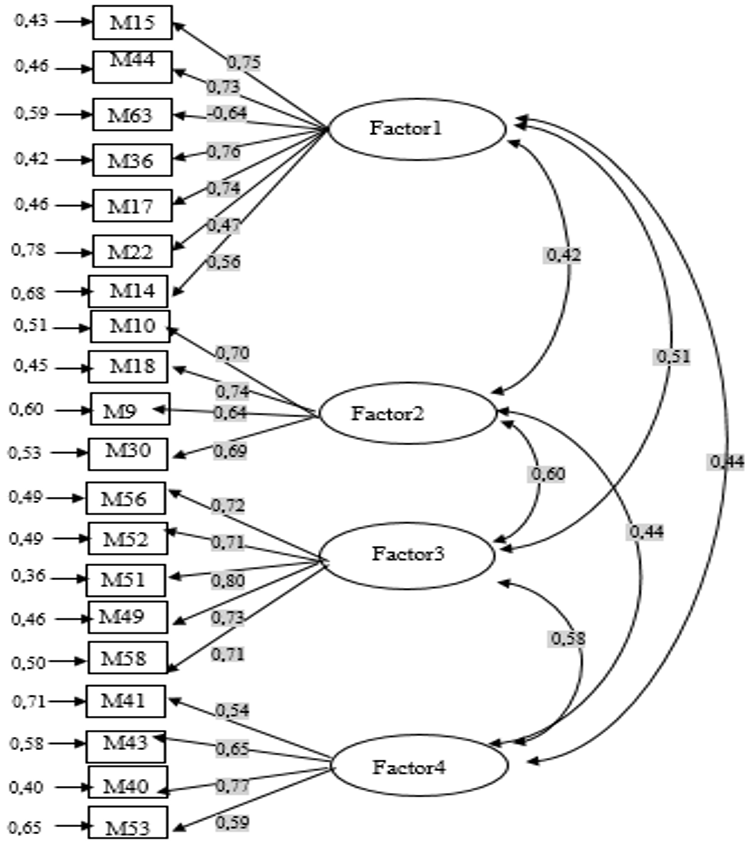 When the analysis results in Table 3 were examined, it was seen that the items after rotation were grouped under 4 factors. As seen in Table 3, factor load valuesrangebetween.788 and.550 for factor 1, between 0.766 and 0.703 for factor 2, between 0.766 and 0.546 for factor 3, and finally between 0.807 and 643 for factor 4. When the factor load values are examined in terms of magnitude, it is possible to characterize the load values from "good" to "excellent" (Cokluk et al., 2016).