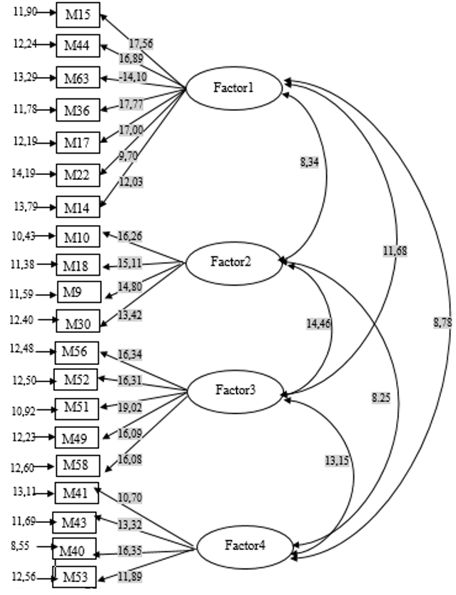 Factor loadings of the scale in Figure 3 are between 0.47 and 0.76 for the 1st factor, between 0.64 and 0.74 for the 2nd factor, between 0.71 and 0.80 for the 3rd factor, and between 0.54 and 0.77for the 4th factor, which is the last one. In the standardized path diagram, the factor structure of the scale and the load values of each item are included. The desired situation for the load values to be is 0.30 and above (Secer, 2017). According to Figure 3, it is seen that all factor load values are above 0.30. After the standard values of the scale, t values were examined. The t values obtained with DFA are shown in Figure 4. Jöreskog and Sorbom (1996) state that it is necessary to examine whether there is a red arrow when examining t values. In this case, it shows that all items that do not have red arrows in the t values among the factors and items in Figure 4 are significant at 0.05 level.