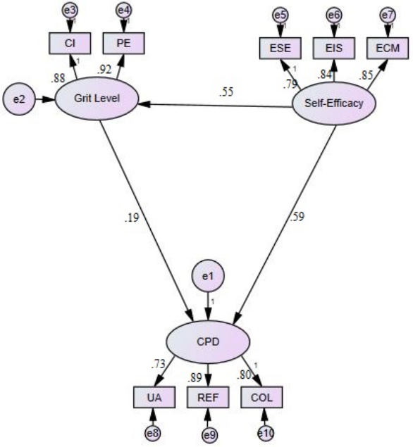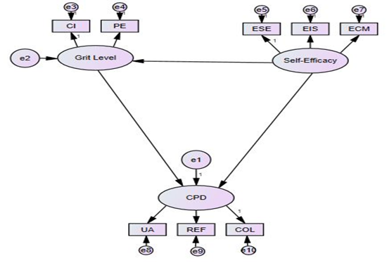 Some studies deal with the connection between perseverance and one's belief in the ability to succeed. Dobbins (2016) addressed this link and reported that self-efficacy enhances teachers' grit levels. The present study assumed that grit and self-efficacy could be predictors of teachers’ CPD. Besides, previous research has proposed seminal contributions that emphasized the significance of self-efficacy as a predictor of CPD. For example, Fischman (2018) conducted a qualitative study using interviews. It was reported that professional development is influenced by self-efficacy. In the light of said definitions on the importance of self-efficacy in teachers, its importance is conceivable in the field as it crucially influences the learning environment and students' attainment (Bandura, 1993). In other words, teachers believe that their effective teaching positively impacts students' learning and inspires them to use the body of professional knowledge available to them to enhance their professionalism and solve their problems. Prior research in the literature acknowledges the significance of psychological factors like teacher grit and self-efficacy that can promote CPD (Richardson, Rivera-Santos, Drulla-Rossi, & Trif, 2020). However, previous research may only be considered the first step towards a more profound understanding of the facets that enhance teachers’ continuing professional development. Due to insufficient research on the concept of professionalism, this research study aims to propose a model and investigate the possible relationships of two non-cognitive skills, including Grit and self-efficacy, with teachers’ CPD using AMOS software. To sum up, the promising lines of this research would answer the following questions: