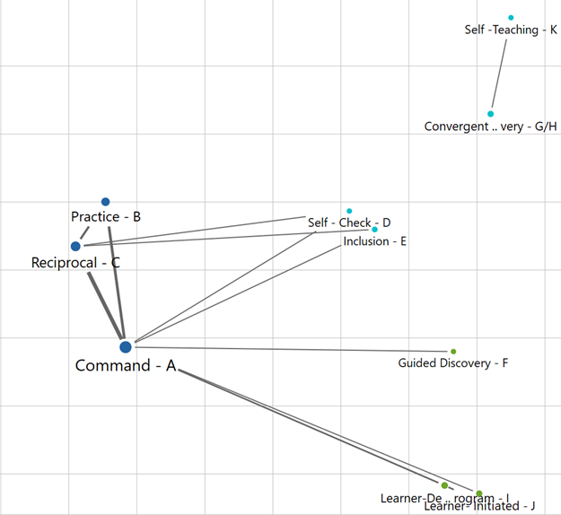 As seen in Figure 1, the code map shows the relationships between codes in a map-like display. The more frequently two codes have been assigned together, the closer they will be on the map. When code map is examined, it is identified that the styles, to which both codes are frequently assigned, are “command- paired- working” and “command-exercise”. When code map is examined, inter code relationships decrease from teaching–centered teaching styles to learning centered teaching styles. Especially, it was revealed that Self- Teaching- K” and “Convergent and Divergent Discovery- G/H” styles, among learning–centered teaching styles, were not related to the other styles at all.