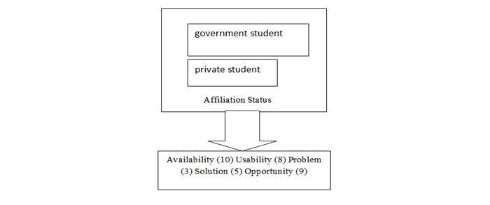 Data from Table 2 evident that calculated T-values are smaller than observed T-values for three factor named availability, usability, and Problem at 5% significant level for 18, 14 and 04 degree of freedom respectively. These values are not significant at 5 % level. Though, there is no mean difference between government student and private student for these factors. Hence, affiliation status of university or institutions did not affect opinions of students towards ICT availability (Av), usability (Us) and problem (Pr). According to Saima (2015 ) there is significant difference between public and private universities for availability of ICT equipment but no significant difference between them for usability. On another side, calculated T-value is greater than observed value for two factor named solution (Sn) and opportunity (Op) at 5% significant level for 08 and 16 degree of freedom respectively. These values are significant at 5 % level. Though, there is a mean difference between government student and private student for these factors. Hence, affiliation status of university or institutions has affected the opinions of students towards ICT solution (Sn) and opportunity (Op) factor.